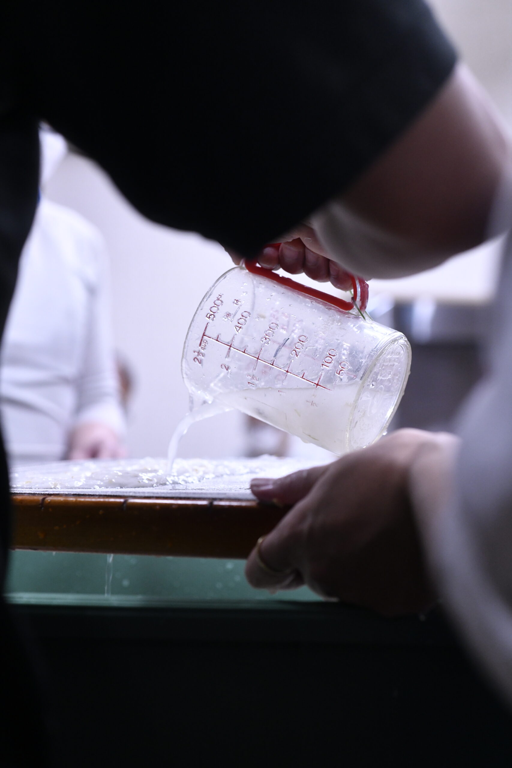 ・福祉施設の方に漉いていただいた味わい深い手漉きの紙でフライヤーを包み、植物の繊維を細かくほぐして綴じる