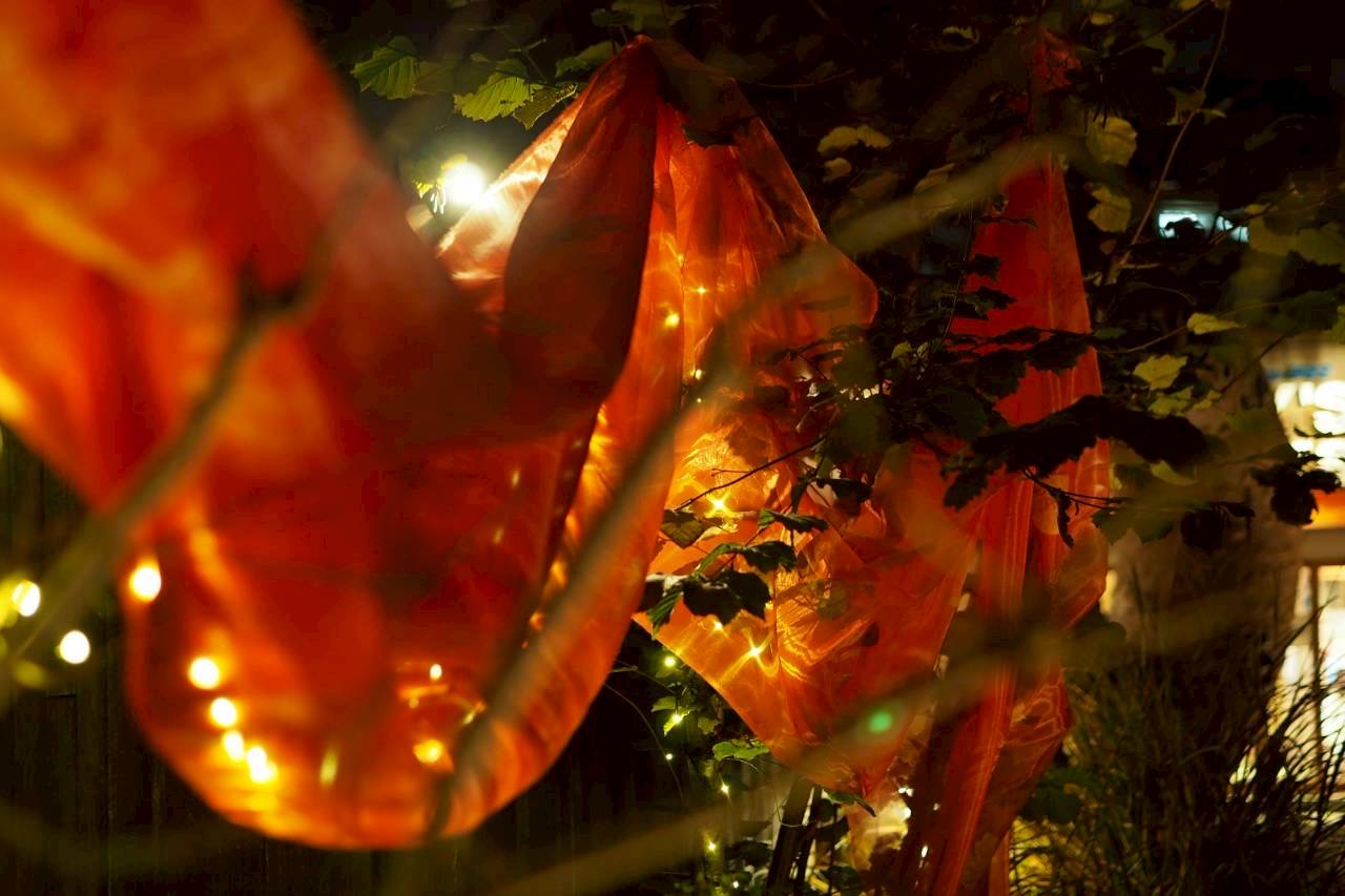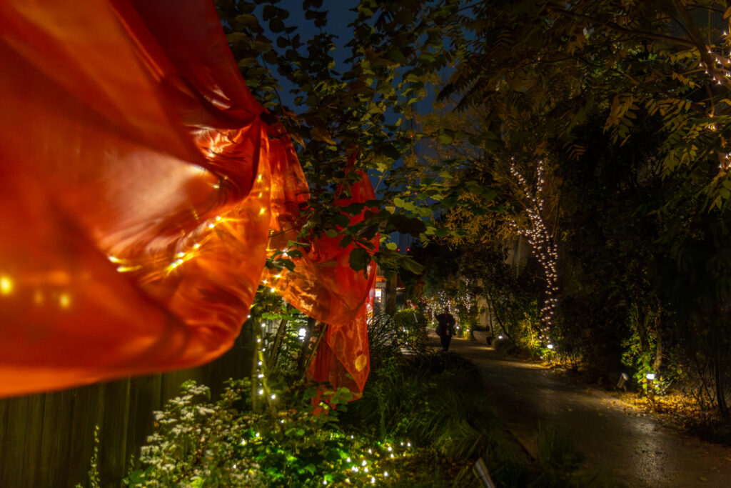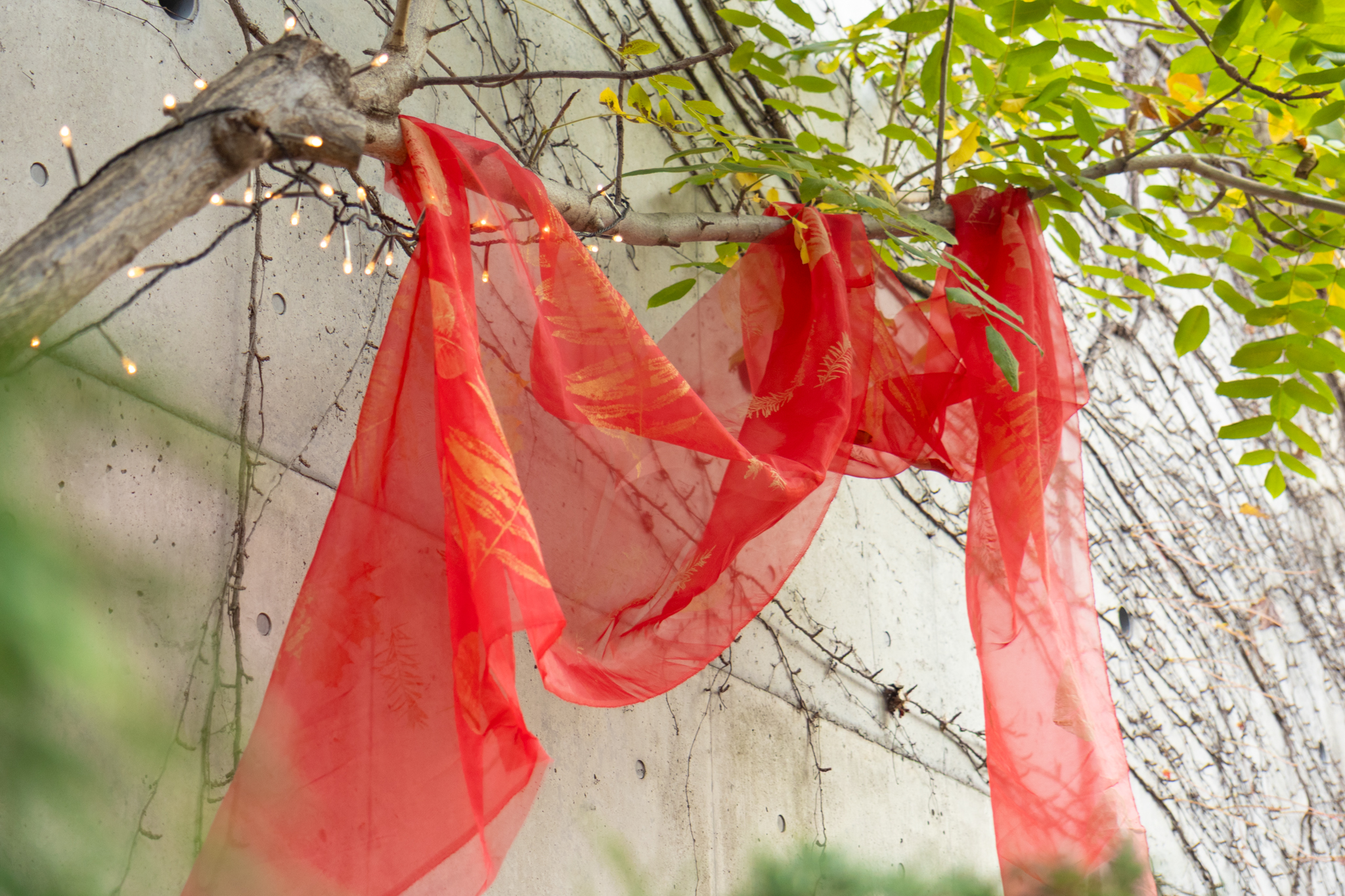 ログロード内の植栽モチーフの真鍮のシルクスクリーンが施された、真っ赤なオーガンジーが散策路を彩りました。