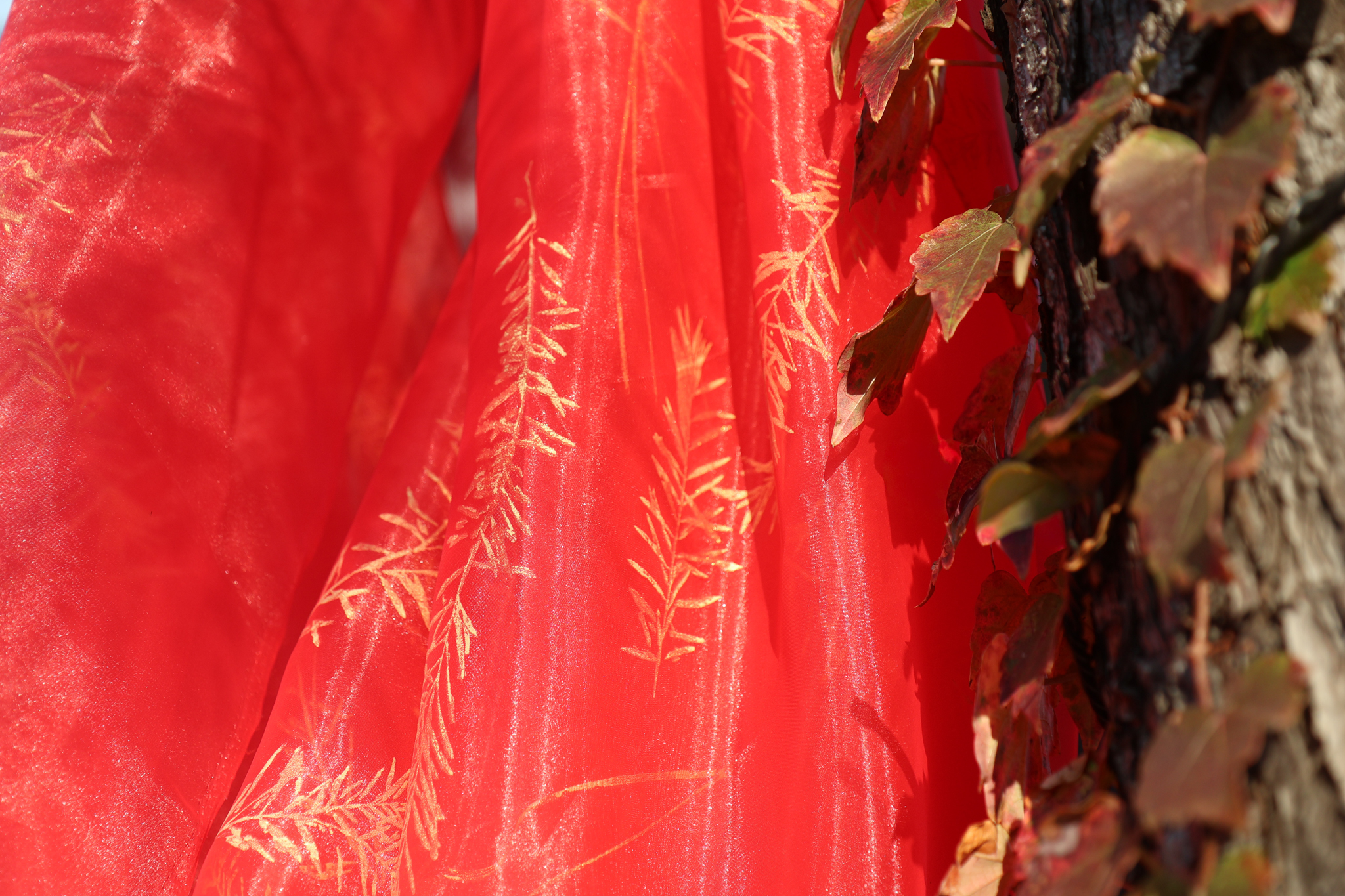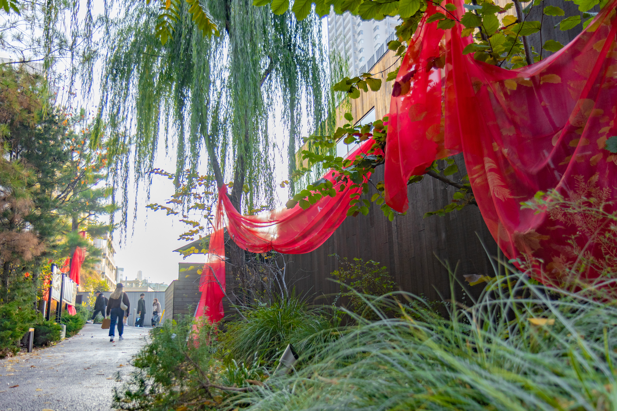 ログロード内の植栽モチーフの真鍮のシルクスクリーンが施された、真っ赤なオーガンジーが散策路を彩りました。